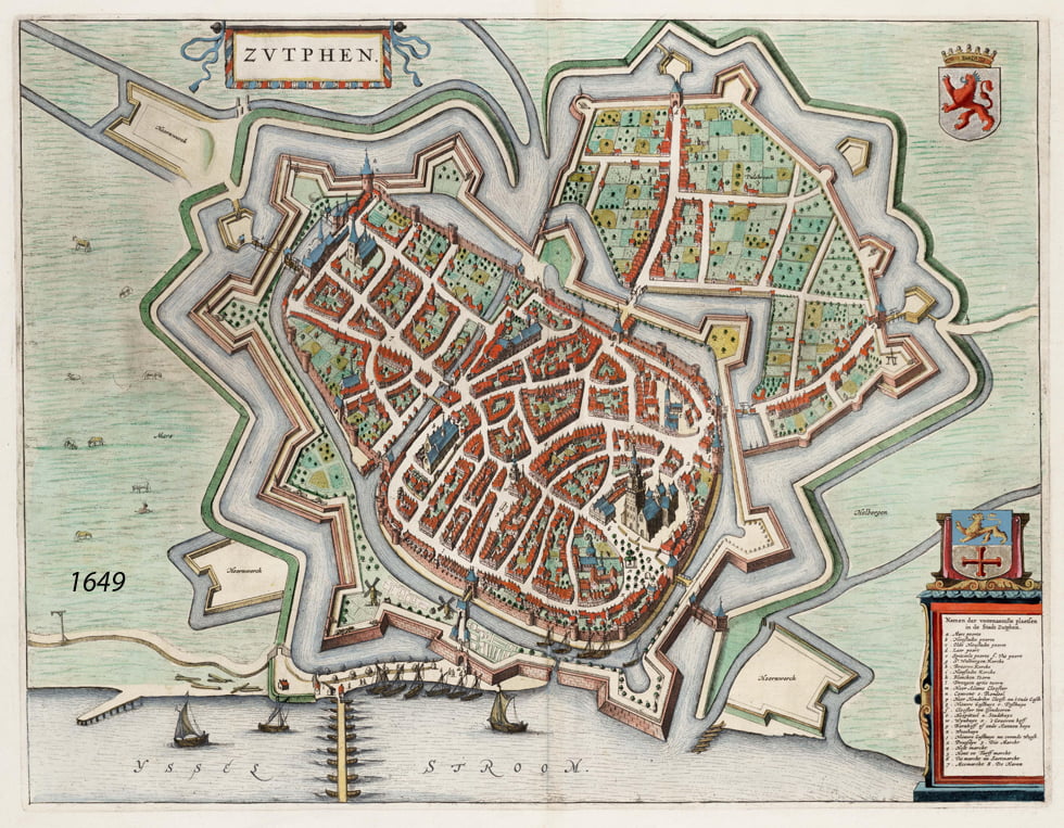 Hieronder is een stukje te zien van de kaart van Zutphen uit de bekende atlas van J. Bleau. In 1652 was de (Boompjes)wal een feit. De aanleg van de wal had grote gevolgen voor de omgeving.