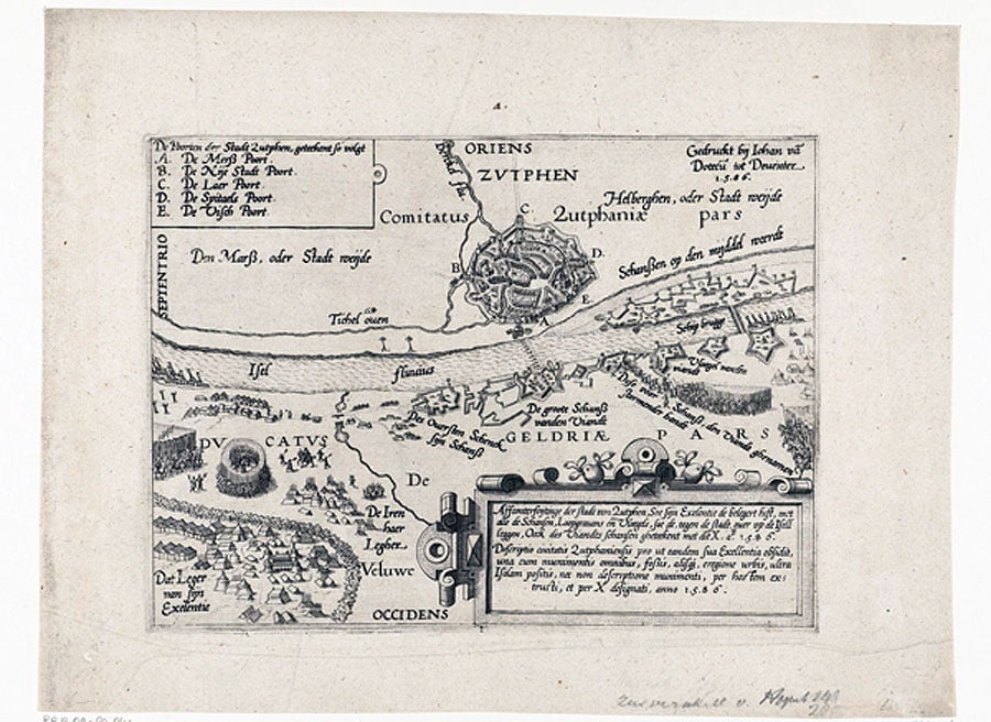 Affconterfeijtinge der stadt van Zutphen, Soe sijn Exelentie de belegert heft, met alle de Schansen, Loopgravens en[de] Vloegels, soe de, tegen de stadt, over op de Isell leggen, Oeck des Viandts schansen gheteekent met dit X. ao. 1.5.86 (titel op object)