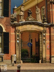 Ruiter Kortegaerd (links op de foto): In 1639 gebouwd door Emond Hellenraet (± 1592-vóór 1664), die vooral bekend is als bouwmeester van de Wijnhuistoren. Bakstenen renaissance trapgevel, de grote trappen opgevuld met klauwstukken. Bekroond door een gebroken tympaan met kleine obelisk. Boven de twee hoofdvensters een soort accoladebogen. Toegangspoort met dorische pilasters. De naam Kortegaerd is een verbastering van Corps de Garde.
