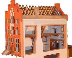 Een kopmanshuis zoals in de middeleeuwen standaard is voor Zutphen. Let op- de “insteek”de tussenverdieping waar gewoond, gekookt, gestookt en geslapen werd. Soldaten werden tot aan de Napoleontische tijd bij de burgers ingekwartierd.