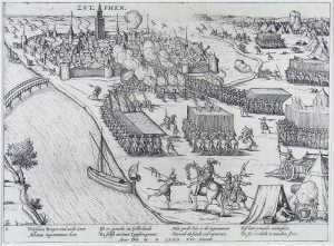 En dat werd in die tijd zeer streng gestraft.” En zo kon het gebeuren dat Don Frederik van Toledo, zoon van Alva, via Bergen (Mons), Mechelen op een koude novemberdag voor de poorten van Zutphen stond. Van Toledo was voorzien van een overzichtelijke plattegrond van Jacob van Deventer, de Rembrandt onder de cartografen in die tijd. De Spanjaarden vielen de stad aan via de noordzijde, het droge terrein leende zich bij uitstek voor de plaatsing van hun kanonnen. Terwijl de schepenen (stadsbestuurders) nog meenden over de overgave te kunnen onderhandelen, vielen de Spanjaarden van uit het noorden via de Nieuwstadspoort de stad binnen. De verdediging was totaal niet opgewassen tegen de slagkracht van het leger en het, voor die dagen, moderne geschut.